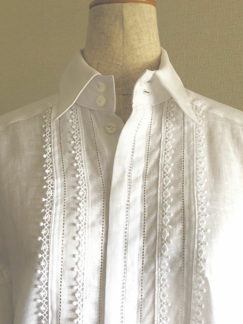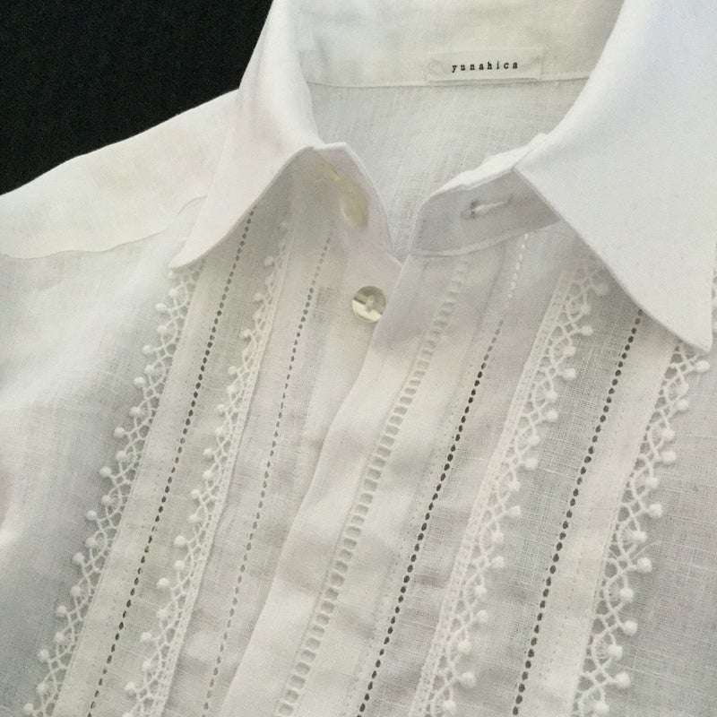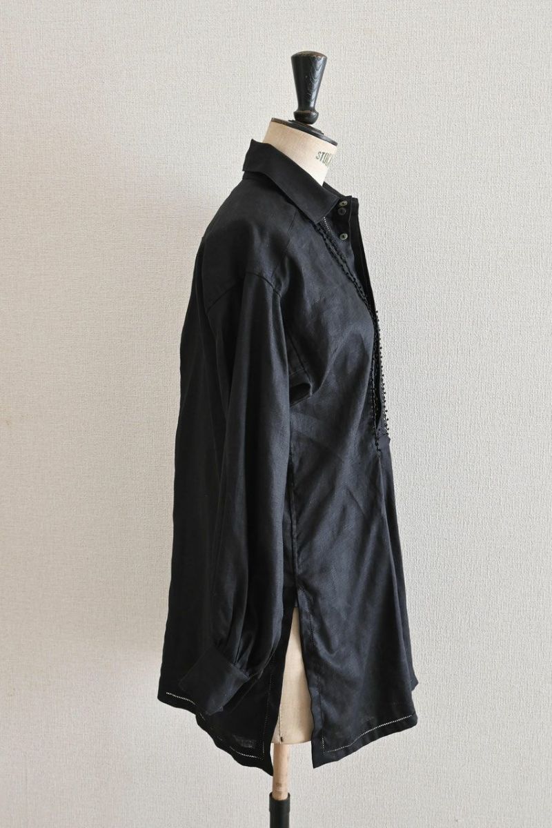 仕様/比翼ボタン5つ、袖口に各1つ 両サイドにスリット ピコレースとハシゴレース使用
