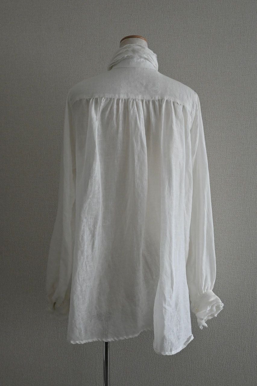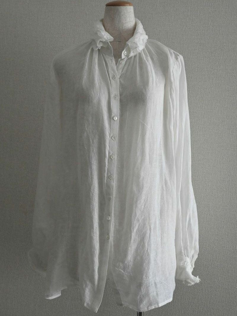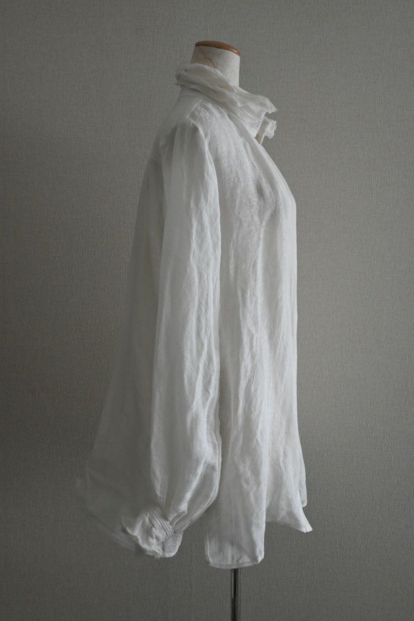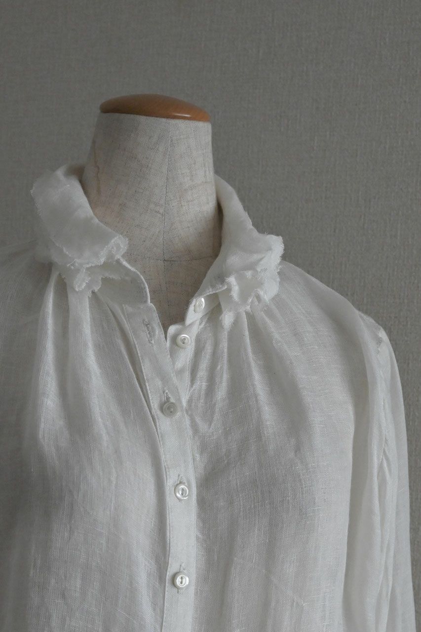 ボリューム感を抑えた、薄いリネンのフリルブラウス