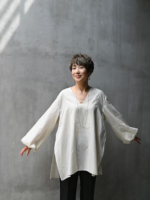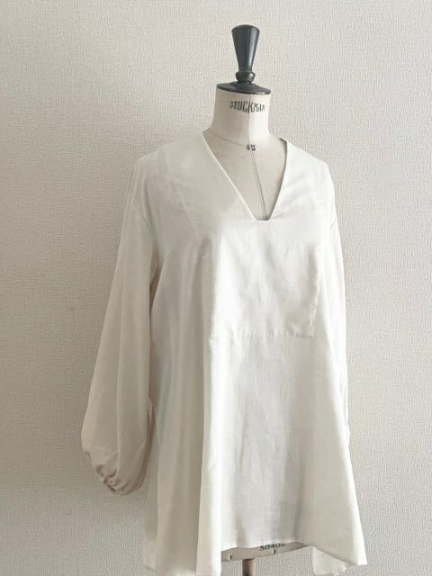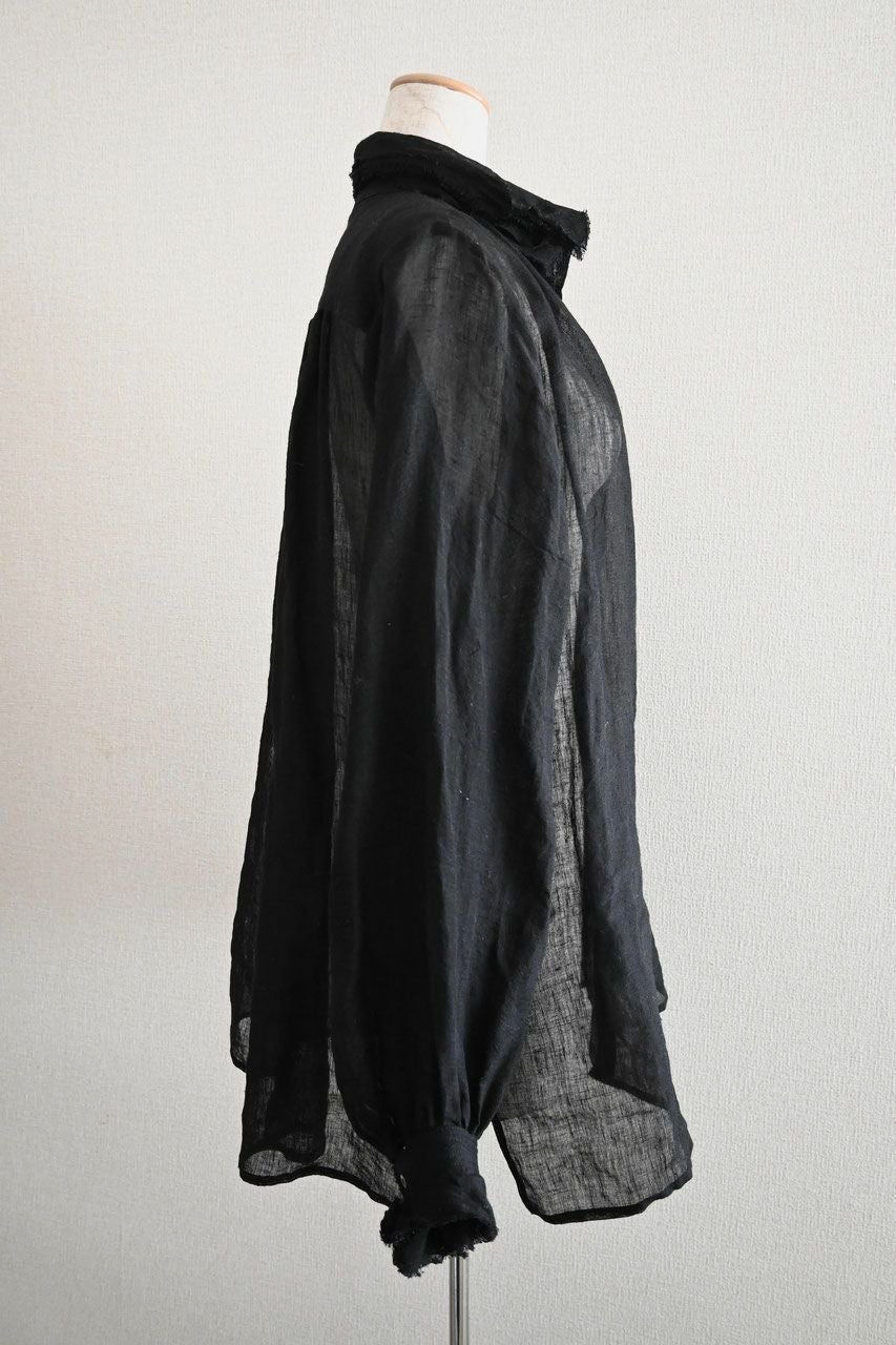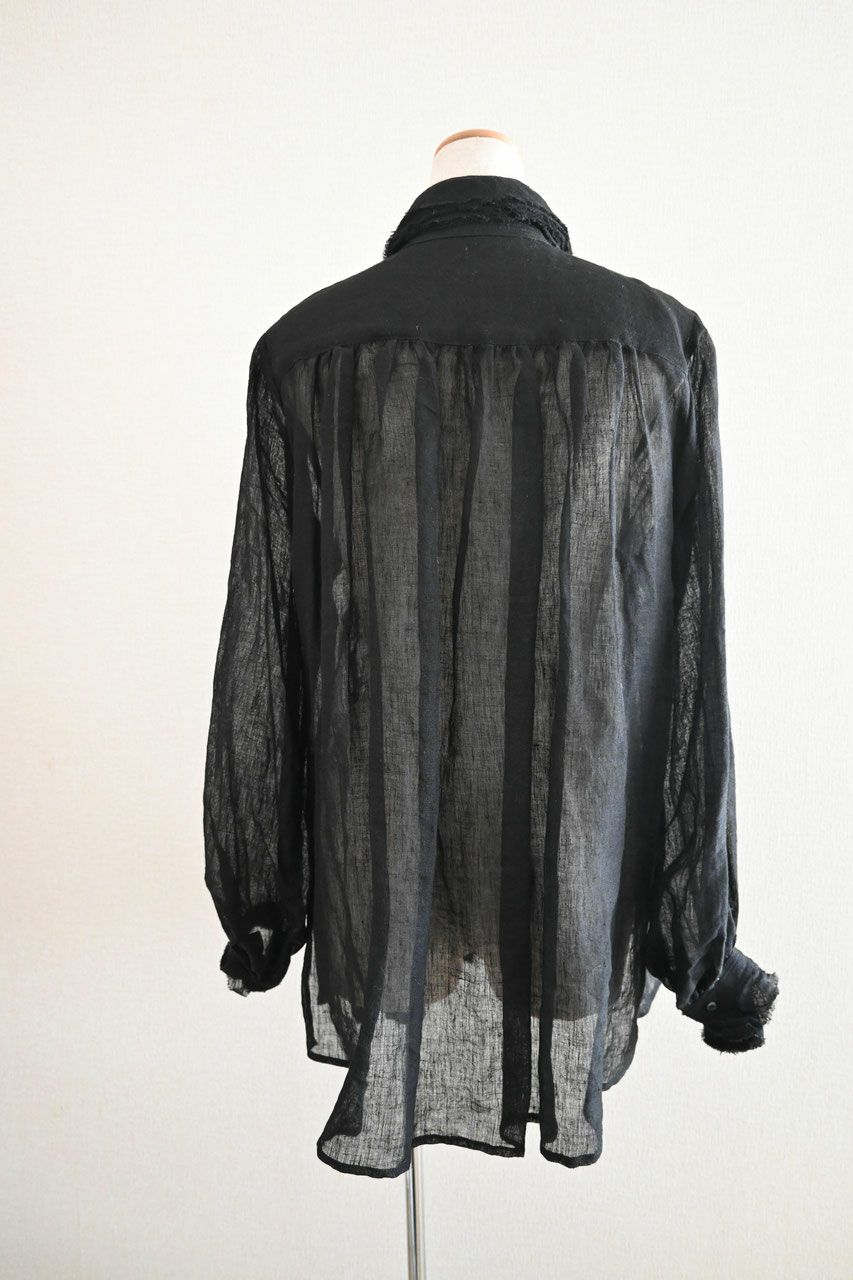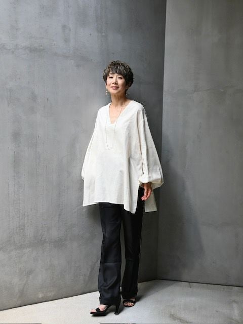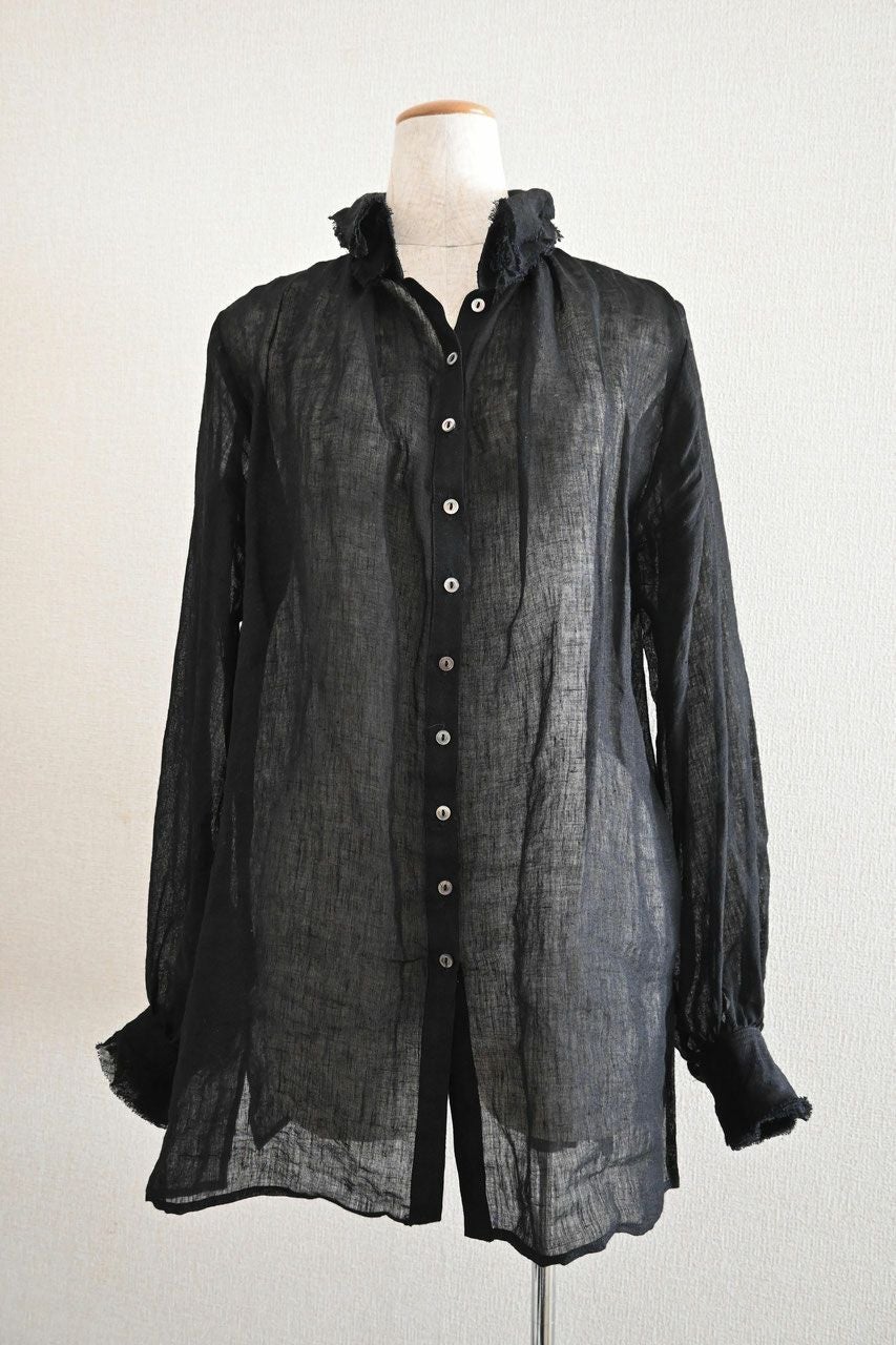 ボリューム感を抑えた、薄いリネンのフリルブラウス