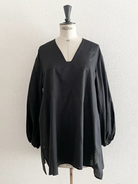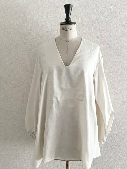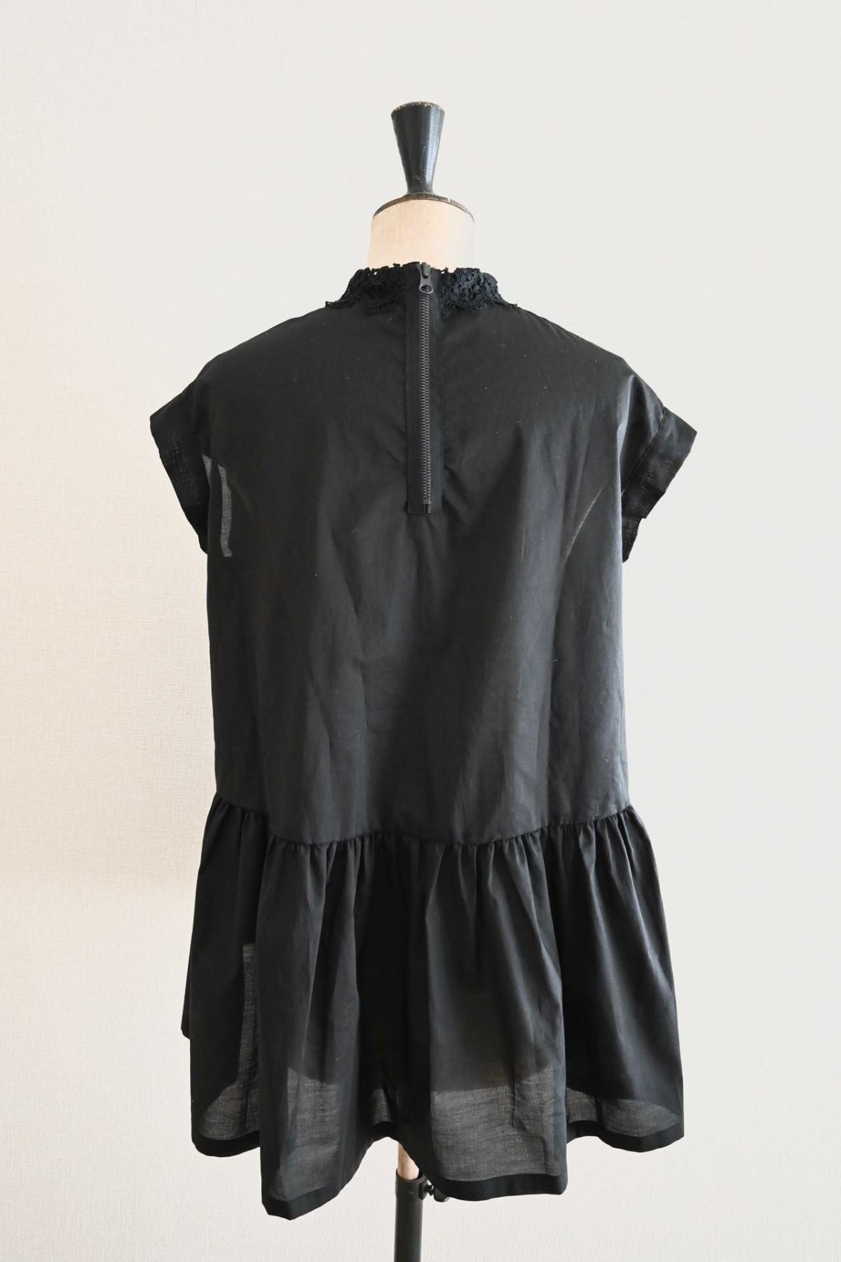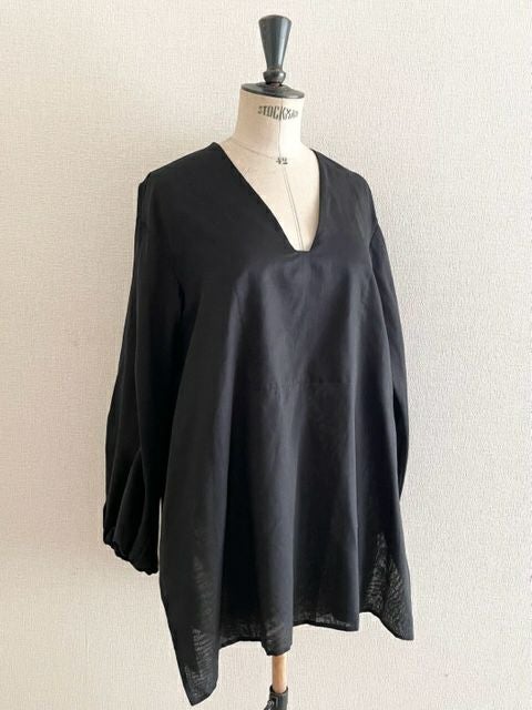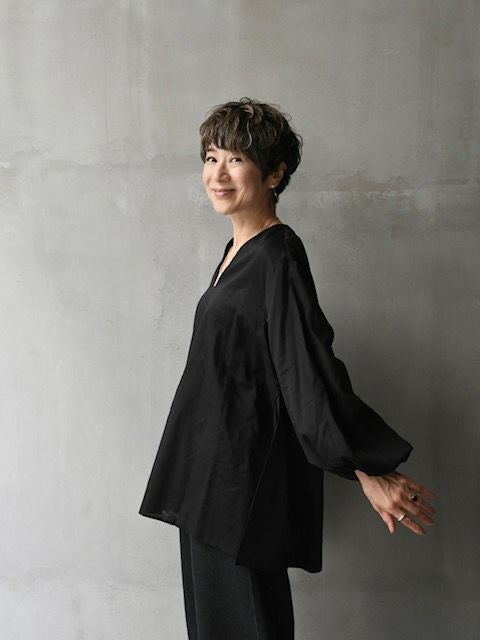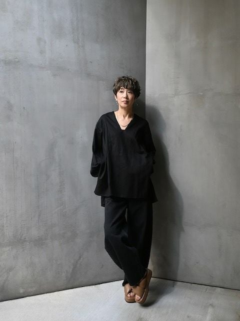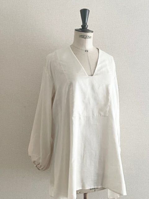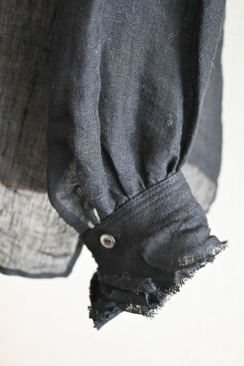 ボリューム感を抑えた、薄いリネンのフリルブラウス